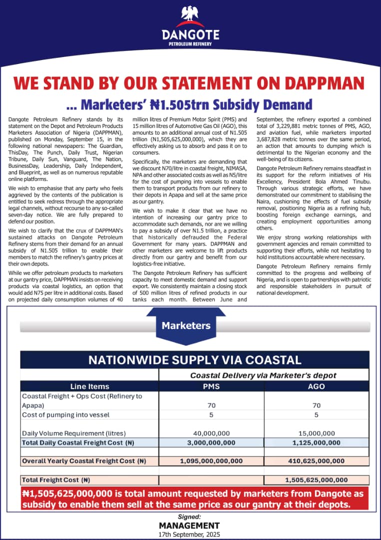 … MARKETERS’ N1.505TRN SUBSIDY DEMAND Dangote Petroleum Refinery stands by its statement on the Depot and Petroleum Products Marketers Association of Nigeria (DAPPMAN), published on Monday, September 15, in the following national newspapers: The Guardian, ThisDay, The Punch, Daily Trust, Nigerian Tribune, Daily Sun, Vanguard, The Nation, BusinessDay, Leadership, Daily Independent, and Blueprint, as well […]